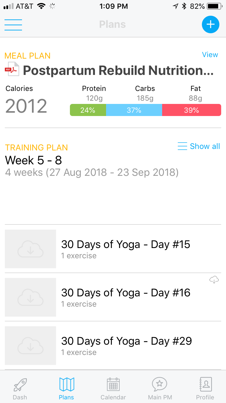 Under Plans, you will find the PDF with nutrition guidelines and macro goals (you can sync My Fitness Pal and track your food intake if you desire). You will also See all the workouts listed (Yoga will be videos from 30 Days of Yoga with Adriene).