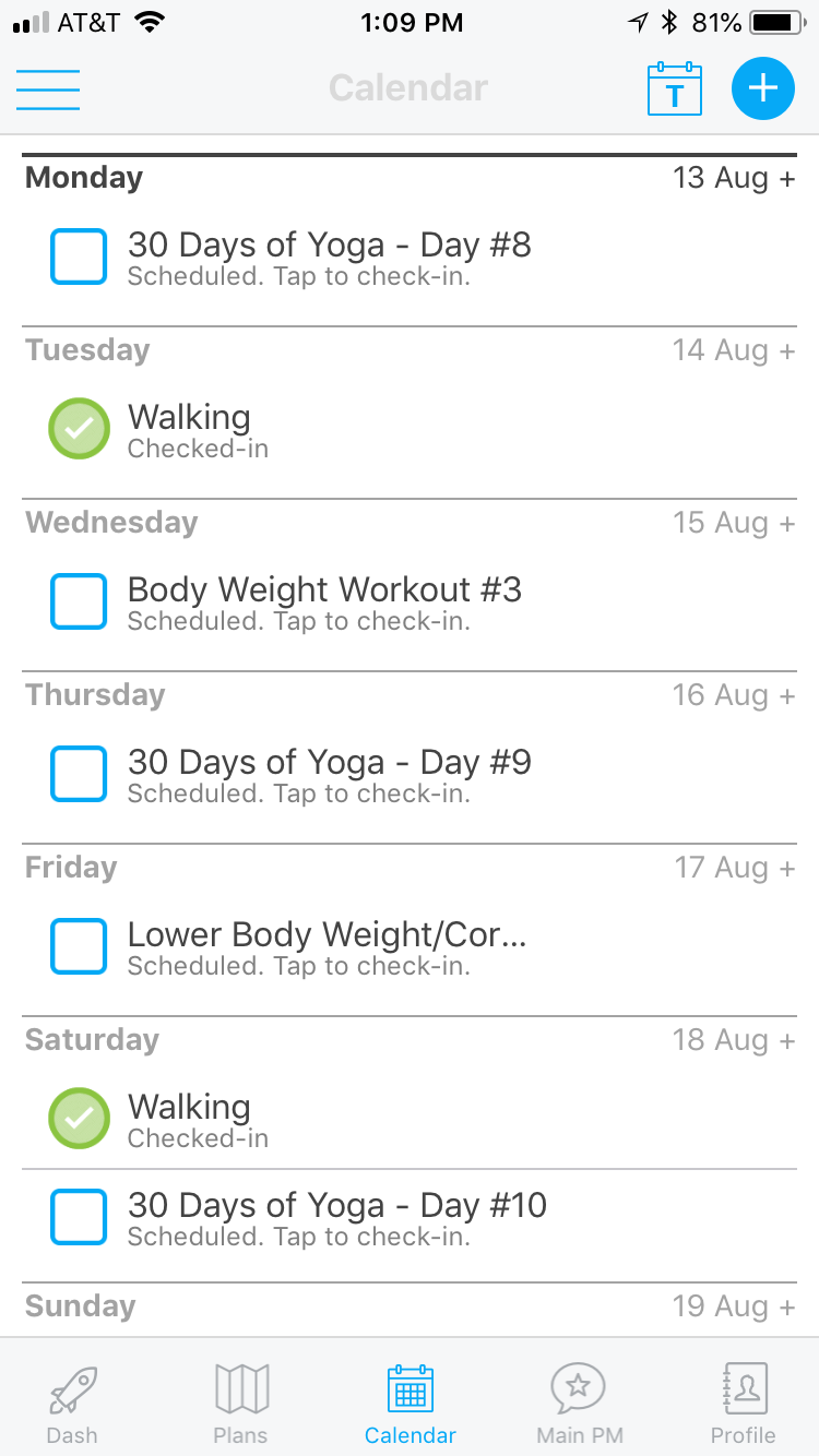 Under Calendar, you will see the schedule of your workouts. You select the workout for the day (or you can select a future or past workout instead).