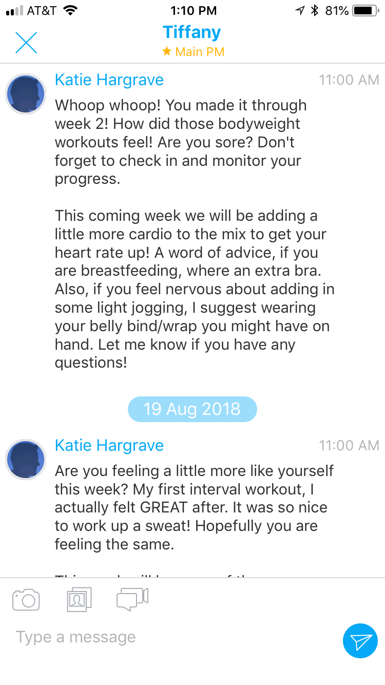 It is totally OK if you can’t get in a workout. We are new moms after all! Just pick up the next day and continue with the group. Also, if you are already going for a walk on a day when there isn’t one assigned, you can mark off the next walk on your calendar and make that your workout for the day instead. This isn’t a rigid program. However, if you don’t do any bodyweight workouts, you wouldn’t want to move on to workouts with added weight. There is a progression. I’m just a message away if you have any questions during the program!