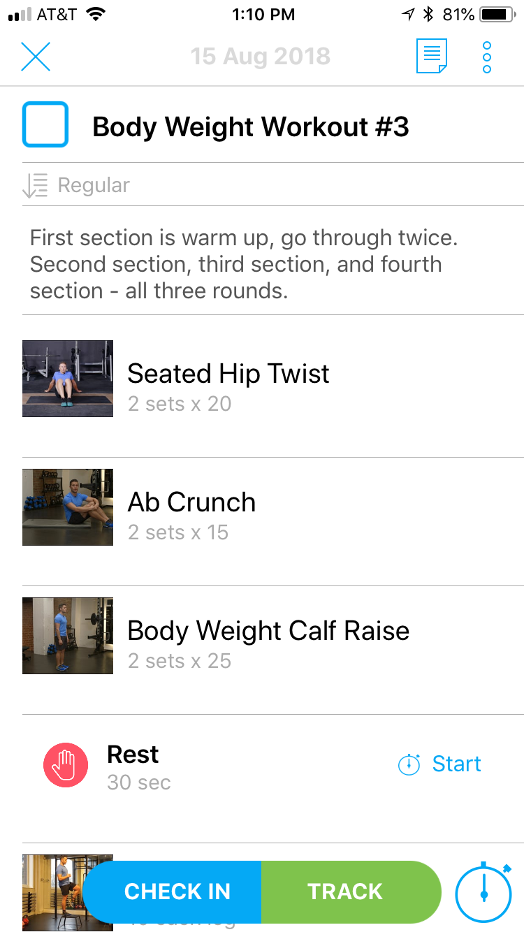Once you select a workout, you will see instructions on what to do. If you are unsure of what an exercise is, press the photo for a video demo of the movement. You can check in for the workout when you are finished, and track the workout to enter how many reps and how much weight you used.